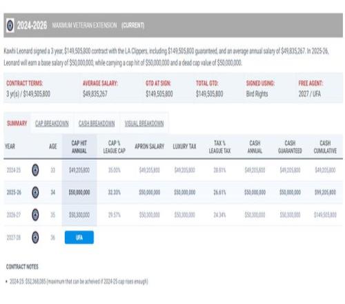 伦纳德此前与快船签下的提前续约合同是三年1.49亿,这份合同没有球员选项,25-26赛季5000万,26-27赛季5030万,伦纳德也只剩下两年1亿的合同,执行完这份合同后他可能也要淡出联盟。