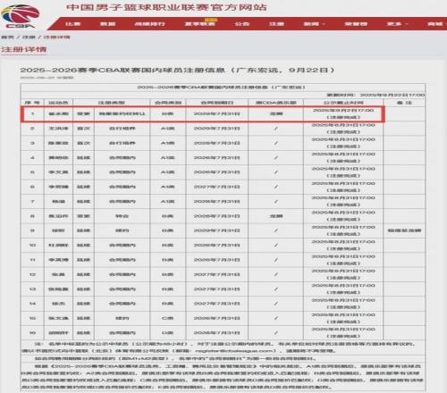 CBA官网更新了广东队25-26赛季国内球员注册信息,显示崔永熙签约四年B类合同。