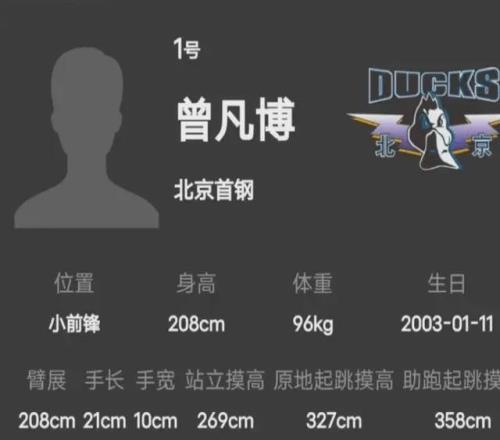 曾凡博并未参加新秀联合试训环节,这在当时引起较大争议,目前网上流传他的身体数据为身高2米08,臂展2米08,体重96KG,站立摸高2米69,原地弹跳58厘米,助跑最大弹跳89厘米,弹跳能力一般。