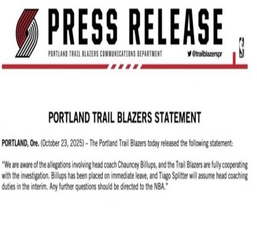 “我们已知晓有关主教练昌西·比卢普斯的指控,波特兰开拓者正全力配合调查,”球队在声明中表示,“ 比卢普斯即日起暂停职务,临时主教练一职将由斯普利特暂代,所有后续进展将由NBA统一处理。”