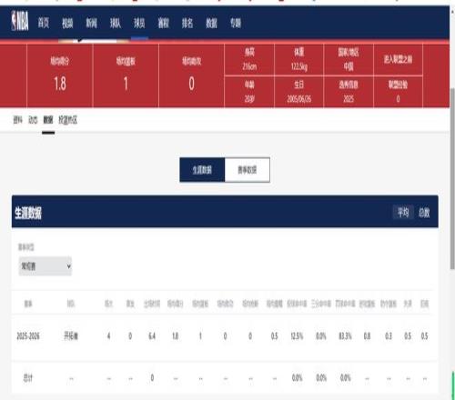 开拓者四战过后,杨瀚森暂时场场可获出场机会,场均出场时间6.4分钟,场均数据1.8分1篮板0.5盖帽,投篮命中率较低,只有12.5%,三分球命中率则是0%,同时场均可出现0.5次失误和0.5次犯规。