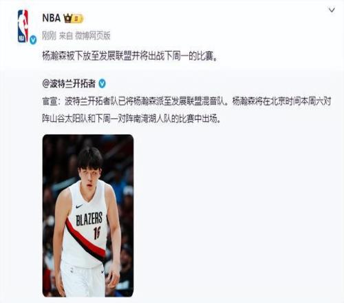 11月14日,NBA波特兰开拓者队官方宣布,已将杨瀚森派至发展联盟混音队。杨瀚森将在北京时间本周六对阵山谷太阳队和下周一对阵南湾湖人队的比赛中出场。