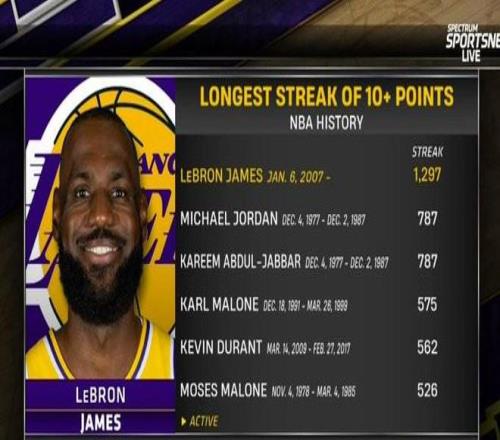 本场比赛,湖人球星詹姆斯首发出战,10投3中得到10分,延续了自己长达近19年的常规赛得分上双纪录。以下是该项纪录的具体排行榜。