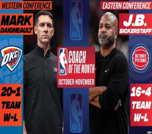 北京时间12月3日,NBA官方公布新赛季第一期月最佳教练,雷霆主帅马克-戴格诺特和活塞主帅JB-比克斯塔夫分别当选。