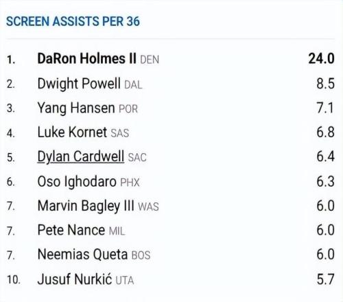 除此之外,根据NBA官方最新公布的数据,杨瀚森本赛季每36分钟掩护助攻7.1次,高居联盟第三。这个数据无疑是非常出色的,也代表着杨瀚森无球掩护的价值相当高。虽然这个数据并不会记录在数据栏上,但实际上他背后彰显的是这位球员的球商以及对球队的潜在贡献。