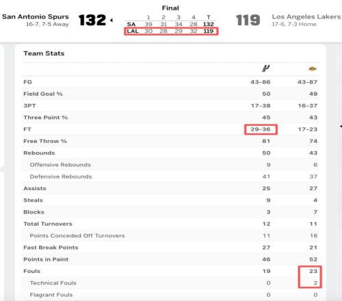 可谁知道,湖人自那之后就再也没有领先过,第二节开始3分钟的得分荒让湖人身处被动,加上马刺加强进攻的侵略性不断冲击篮筐造成犯规走上罚球线和湖人队无谓的犯规越来越多,湖人就此交出了主动权。这样的情况此后成为了全场比赛的主旋律,从技术统计来看,湖人全场比赛多达23次犯规,让马刺在罚球线上拿了28分,这近乎是湖人队一节的得分。