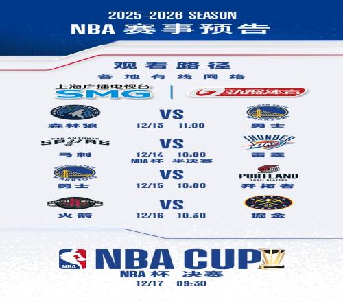 进入NBA杯半决赛,东西部总共四支球队将前往拉斯维加斯,争夺最终的NBA杯冠军!如果您不知道在哪里能够收看如此精彩的比赛,那小编提醒您关注劲爆体育频道!12月14日和12月17日,让我们一同见证NBA杯冠军的诞生!与此同时,劲爆体育频道还将为您带来精彩的常规赛较量,更能和杨瀚森一同闯荡NBA!