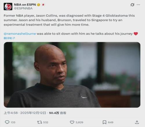 北京时间12月12日,据ESPN报道,NBA宣传大使、前篮网中锋贾森-科林斯被诊断出患有四期胶质母细胞瘤。脑癌四期(IV期)是脑癌中最晚期,科林斯的生命只剩下12个月左右。科林斯和丈夫布伦森-格林前往新加坡,尝试一种新疗法。