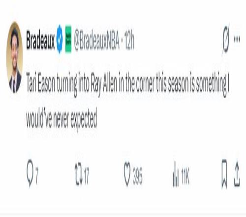 火箭记者Bradeaux继续写道:本赛季塔里-伊森的三分表现竟然跟雷阿伦如出一辙,这让我意想不到。