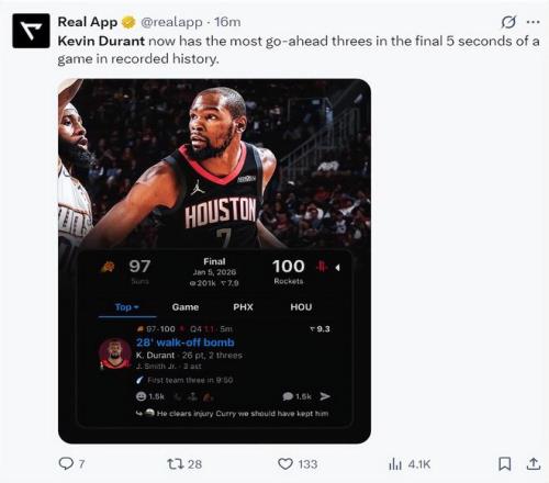 美媒:杜兰特目前在比赛最后5秒投中的三分球数量,是体育史上篮球项目中最高纪录。