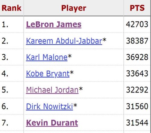 加盟火箭队的首个赛季,杜兰特已在得分方面超越了另一位传奇球星。本月早些时候,在客场不敌开拓者队的比赛中,他的生涯总得分完成对张伯伦的超越,跻身历史得分榜第七。杜兰特和目前排在第五的迈克尔-乔丹(32292分)之间还差700多分,按目前的得分势头,很有机会在本赛季超越乔丹。