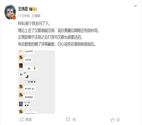 “RNG那个我去问了下。理论上还了欠薪就能注册,现在离最后期限还有段时间。