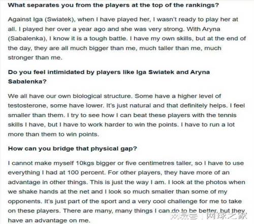 科斯秋克的言论中最为网友质疑的一点,在于她对身高的描述。根据官方数据,科斯秋克身高1.75米,而斯瓦泰克为1.76米,两人身高仅差1厘米。而萨巴伦卡身高1.82米,确实比科斯秋克高出7厘米,但这一差距在女子网坛并不罕见。