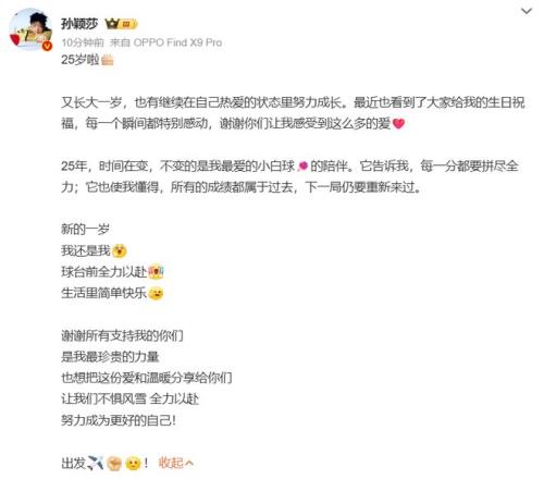 孙颖莎对此非常感谢:“最近也看到了大家给我的生日祝福,每一个瞬间都特别感动,谢谢你们让我感受到这么多的爱。25年,时间在变,不变的是我最爱的小白球的陪伴。它告诉我,每一分都要拼尽全力;它也使我懂得,所有的成绩都属于过去,下一局仍要重新来过。”