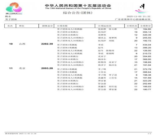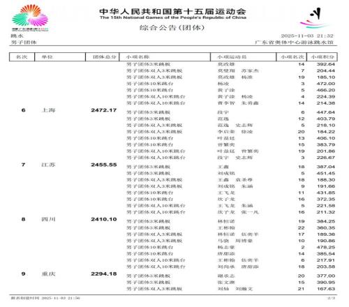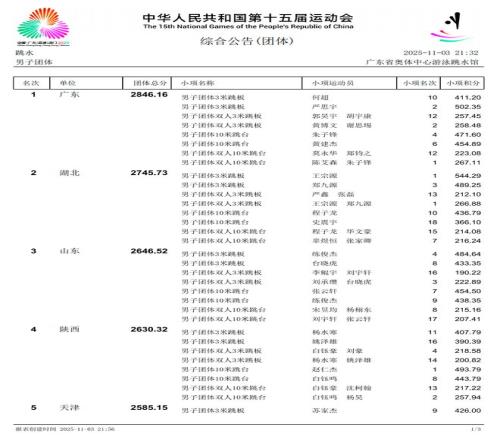 广东队陈艾森/朱子锋在双人10米跳台中以高难度和高完成度斩获第一,为广东队锁定跳水男团金牌。广东队成功包揽第十五届全国运动会跳水男、女团冠军。广东女队2日获得跳水女子团体金牌。