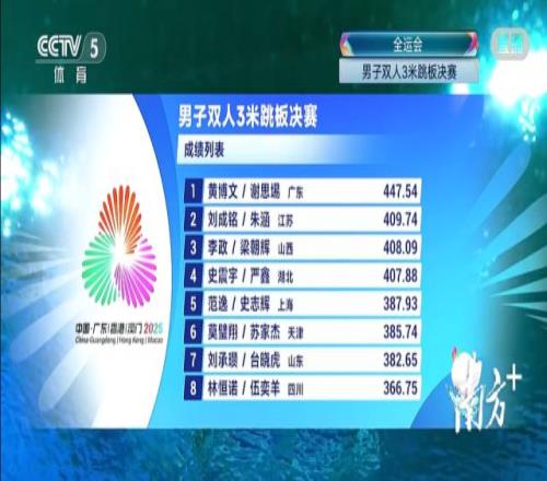 11月6日晚,十五运会跳水男子双人3米跳板项目决赛中,谢思埸/黄博文组合获得冠军,为广东队再添一枚金牌!这是广东队在十五运会跳水项目上的第4块金牌。