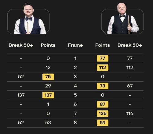 希金斯对阵墨菲的比赛中,希金斯打出两杆单杆破百(112、116)和两杆50+(77、67),墨菲打出一杆137分和两杆52分,上半场希金斯取得3-1的领先,休息归来后墨菲轰出137分扳回一城,随后希金斯连胜两局拿到赛点,第八局两人面对最后一颗红球展开争夺,希金斯准进上演逆转,最终6-2获胜。