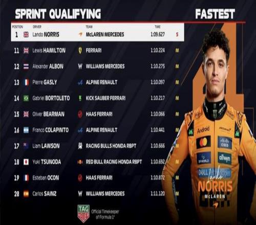 北京时间11月8日,F1巴西大奖赛冲刺排位赛结束。诺里斯夺得杆位,安东内利、皮亚斯特里位居二三。拉塞尔第4,阿隆索第5,维斯塔潘第6,斯特罗尔第7,勒克莱尔第8,哈贾尔第9,霍肯博格第10。汉密尔顿第11&止步SQ2,角田裕毅第18。