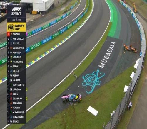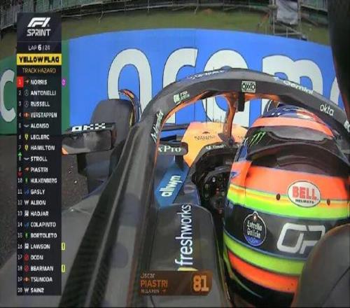 冲刺赛五盏红灯熄灭,大家起步都没有问题,维斯塔潘超越阿隆索上到第五位。比赛进行到第6圈,皮亚斯特里上墙!克拉平托与霍肯伯格也卷入事故,赛会干事先是启动安全车,随后还是出示红旗!小皮和克拉平托退赛,回放显示皮亚斯特里、霍肯伯格和克拉平托都是在压到3号弯的潮湿路肩后失控撞墙。