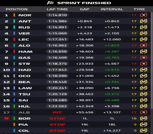 2025赛季F1大奖赛本周末来到英特拉格斯赛道,在刚刚结束的冲刺赛上,皮亚斯特里遭遇事故退赛,诺里斯领跑获得冠军!安东内利获得第二,拉塞尔紧随其后,维斯塔潘拿到第四!