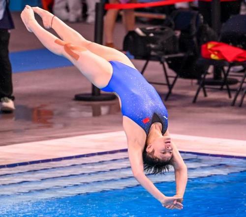 11月10日,广东队选手陈艺文以380.55分半决赛第一名的成绩晋级决赛。 当日,第十五届全国运动会跳水项目女子3米跳板半决赛在广州举行。 新华社记者 唐奕 摄
