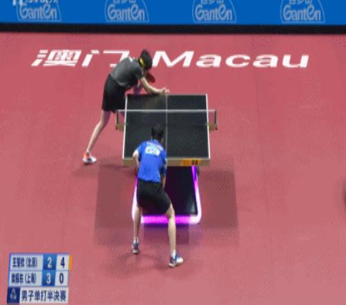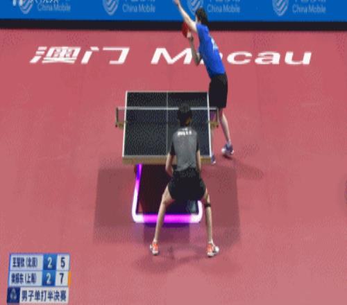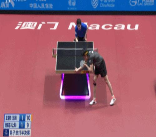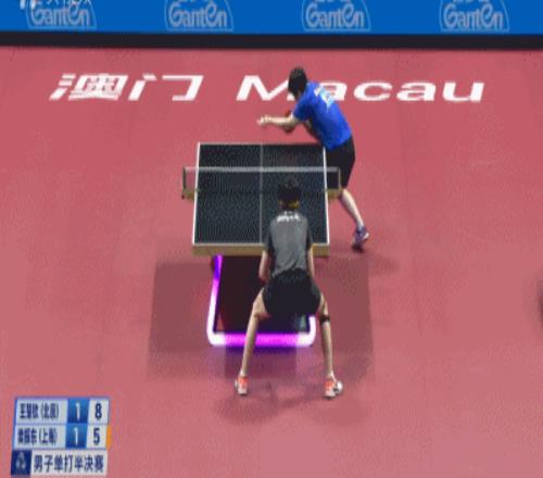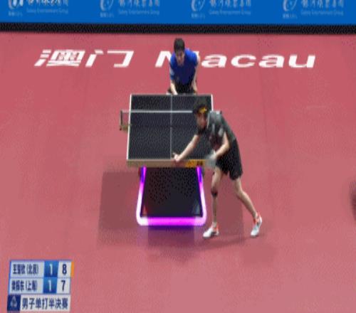 但是王楚钦在发球环节给樊振东极大压力——1比3,王楚钦发了一个台角保护的半出台,樊振东一吊,被早等在位置的王楚钦一个倒地爆冲。