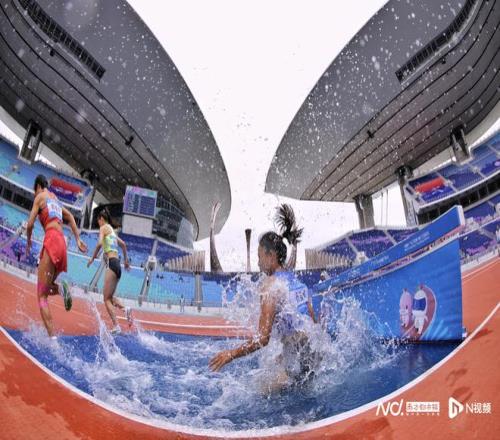 女子3000米障碍赛听障决赛,辽宁运动员杨美萍跨越障碍落入水池的一刻。最终她获得该项目铜牌。