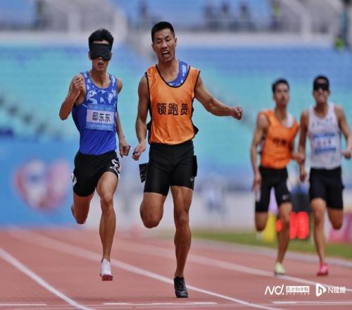 男子200米T11级决赛,第一名邸东东与领跑员一起冲过终点。