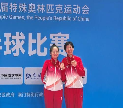 刘旭(右)和搭档周迪奋取得残特奥会乒乓球女双TT10比赛铜牌,两人的左手紧紧握在一起