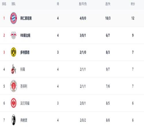在积分榜上,拜仁以12分高居榜首。莱比锡紧随其后,拿到9分。多特蒙德则是7分排名第3。不过,多特蒙德只踢了3场,比前2名的都少踢1场。科隆和圣保利也是7分,排名第4和第5名。
