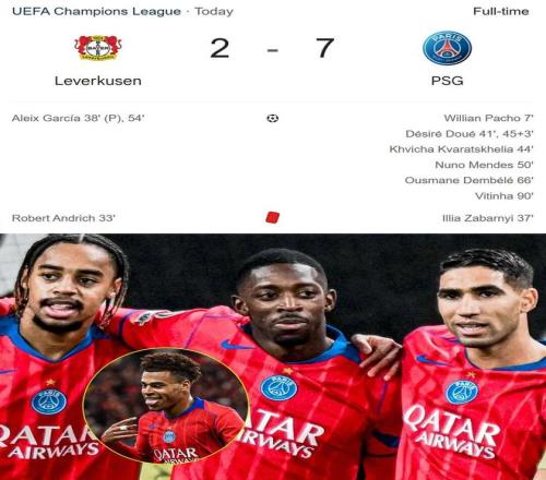 毫无疑问,今晚真正的主角是卫冕冠军巴黎圣日耳曼——他们在德国7-2血洗勒沃库森。上半场,杜埃梅开二度,威廉·帕乔与克瓦拉茨赫利亚也先后进球;药厂方面,格里马尔多罚丢点球,加西亚点球扳回一分。