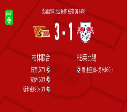 北京时间12月13日德国足球顶级联赛 联赛 第14轮,柏林联合主场对阵RB莱比锡。柏林联合伯克破门,安萨破门,斯卡克破门。RB莱比锡蒂迪亚姆-戈米破门。最终比分柏林联合 3-1 RB莱比锡。