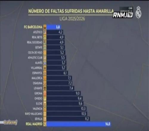 直播吧09月23日宣 在新一期节目中,皇马TV对比了各队犯规数与黄牌数的情况,其中皇马的对手平均16次犯规才会获得1张黄牌,西甲最多,同时皇马每6.6次犯规就会获得1张黄牌;而巴萨的对手平均3.8次犯规就会获得1张黄牌,西甲最少。
