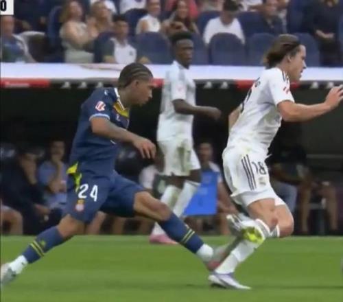 在皇马vs西班牙人的比赛中,西班牙人全场20次犯规但没有一张黄牌,而皇马全场犯规10次,吃到了2张黄牌。比赛中西班牙人球员多兰从身后蹬踏卡雷拉斯小腿没有吃牌,引起了皇马替补席的强烈抗议。