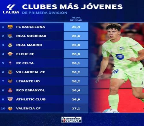 北京时间9月24日,德国转会市场列出了西甲球队平均年龄最低的球队前十名,其中巴萨以25.4岁居首,皇家社会以25.6岁位居第二,皇马以25.8岁位居第三,这三支球队是仅有的平均年龄低于26岁的球队。