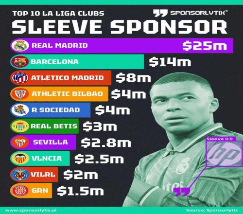 西甲俱乐部球衣袖标赞助金额前10(美元)