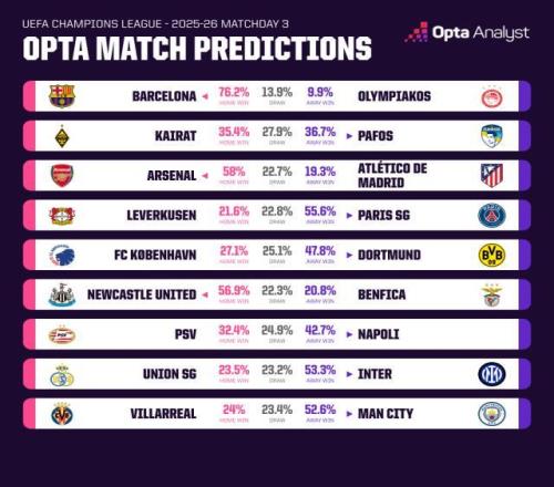 若阿森纳再胜马竞,那就是对西甲球队的7连胜,刚刚由他们创造的欧冠历史“对西班牙对手最长连胜纪录”又将刷新。而赛前的预测也是倾向于枪手占优,根据Opta的超级计算机模拟推演,阿森纳主场获胜的概率高达58%,马竞客场全取3分的概率则只有19.3%,余下22.7%的模拟结果是平局。