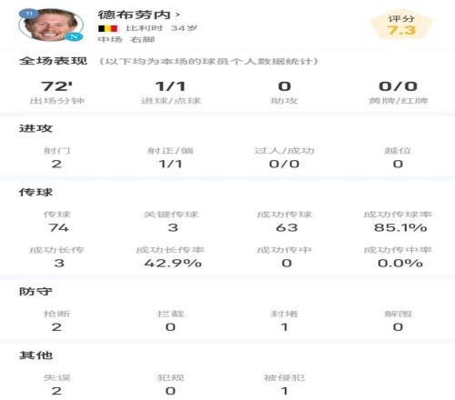 74次传球,3次关键传球,63次成功传球,传球成功率85.1%
