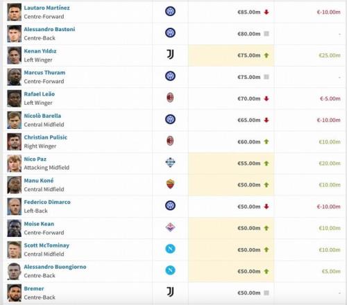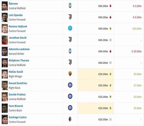 本期德转意甲身价更新中,上涨最多的是尤文新星伊尔迪兹,身价上涨2500万欧,科莫队的尼科-帕斯身价上涨了2000万欧。下跌最多的则是亚特兰大前锋卢克曼,下跌了2000万欧。