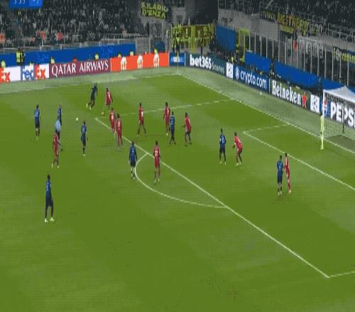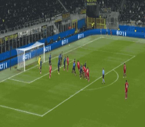 直到第38分钟,国米才完成了本场的第一次射门,巴雷拉的任意球绕过人墙,稍稍偏出。