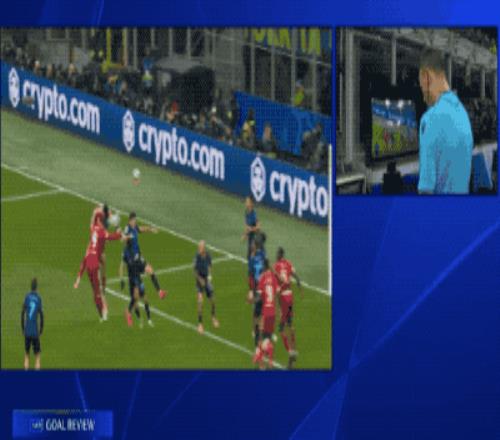 国米球员投诉范迪克手球,VAR介入,经过5分钟的等待,裁判亲自查看后,认定范迪克手球助攻,进球无效。