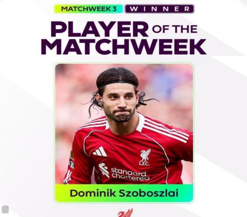 直播吧9月3日宣 英超官方宣布,经过球迷票选,利物浦中场索博斯洛伊当选为本轮英超最佳球员。