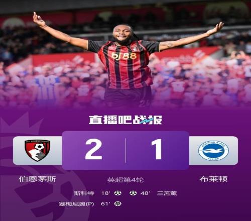 全场比赛结束,伯恩茅斯主场2-1战胜布莱顿。
