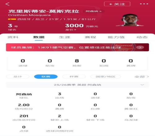 今夏,阿森纳仅花费1500万欧转会费,便从瓦伦西亚签下了还剩1年合同的莫斯克拉,如今21岁的西班牙中卫身价3000万欧,本赛季已出战3场比赛。