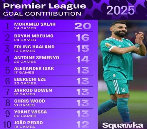 直播吧9月19日宣 数据网站Squawka盘点了2025年英超参与进球榜(进球+助攻),萨拉赫居首,具体如下: