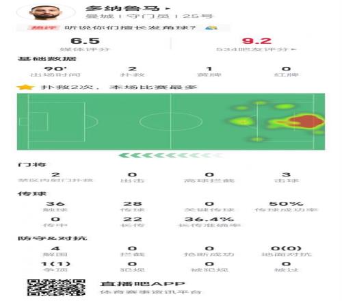 赛后技术统计数据显示,多纳鲁马本场比赛有两次扑救,均为面对对手在禁区内的射门。多纳鲁马全场28次传球成功率50%,22次长传成功率36.4%,另外他还有4次解围。