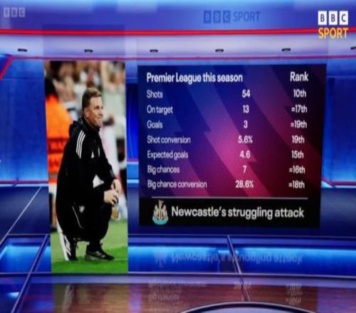 直播吧9月22日宣 英超第5轮比赛,纽卡客场0-0战平伯恩茅斯。据BBC统计,纽卡本赛季多项进攻数据排名英超后几位。