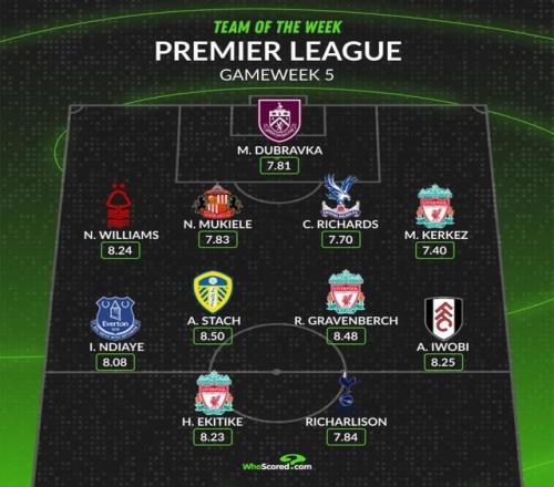 直播吧9月22日宣 WhoScored评出了英超第5轮比赛最佳阵容,理查利森、埃基蒂克在列,利物浦3名球员入选。