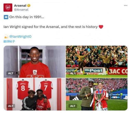 直播吧9月23日宣 34年前的今天,伊恩-赖特加盟阿森纳,枪手官方社媒晒照片回顾。