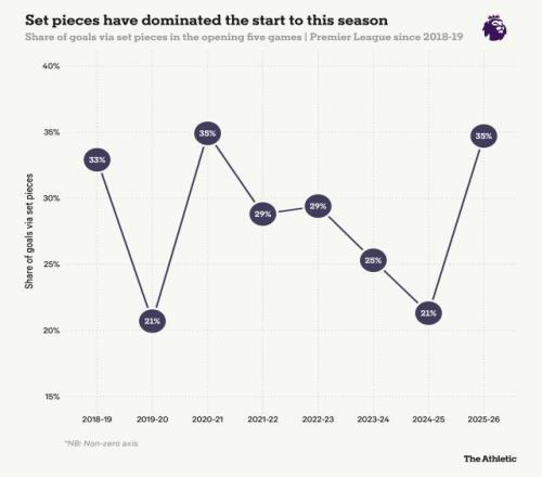 英超开季5轮,权威媒体竞技网总结了现阶段的一些趋势和现象。明显的一条是,本季定位球重要性大幅提升,迄今35%的进球来自定位球(包括点球),而上季同期只有21%。22个角球进球是3年来新高。164个进攻三区界外球直接大力抛进禁区,更是惊人提升:2018-19赛季以来,这是同期这一数值首次达到三位数。